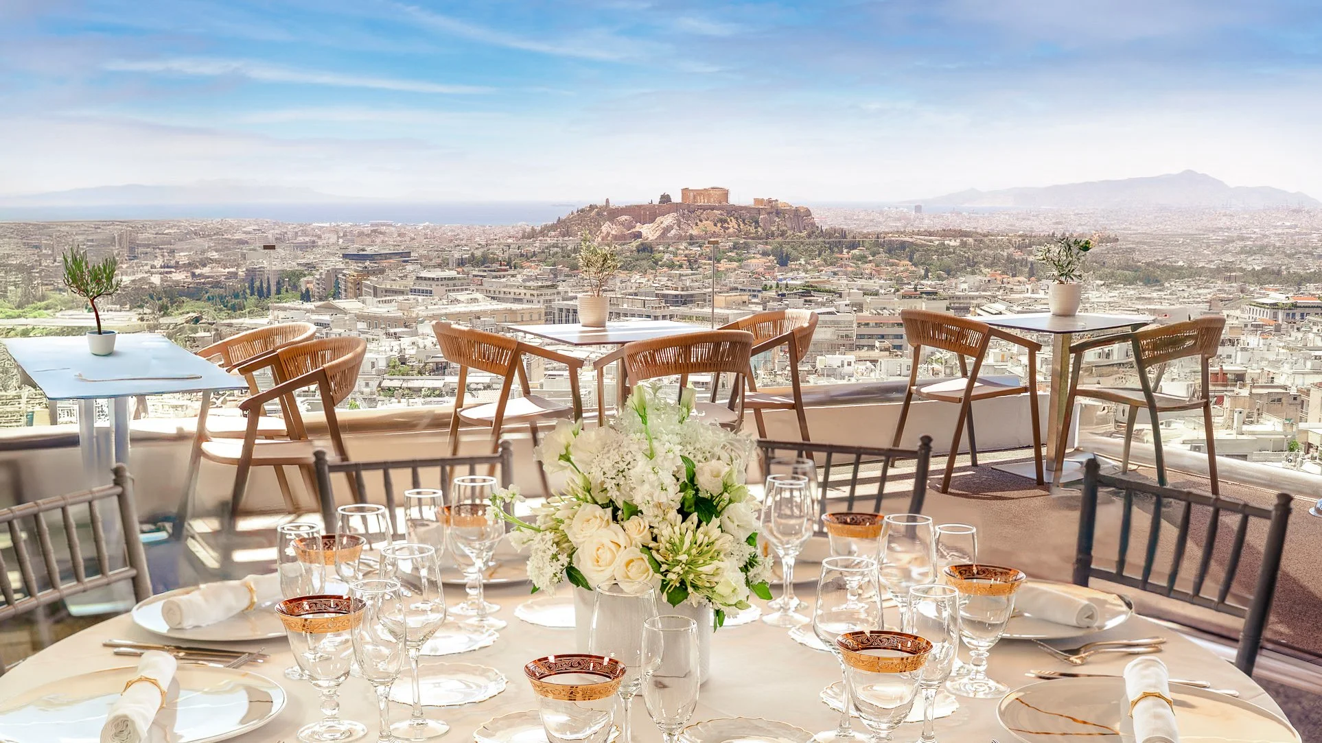 Experience private rooftop dining in Athens inside heated transparent domes. Enjoy 360° Acropolis views and a gourmet tasting menu at St. George Lycabettus